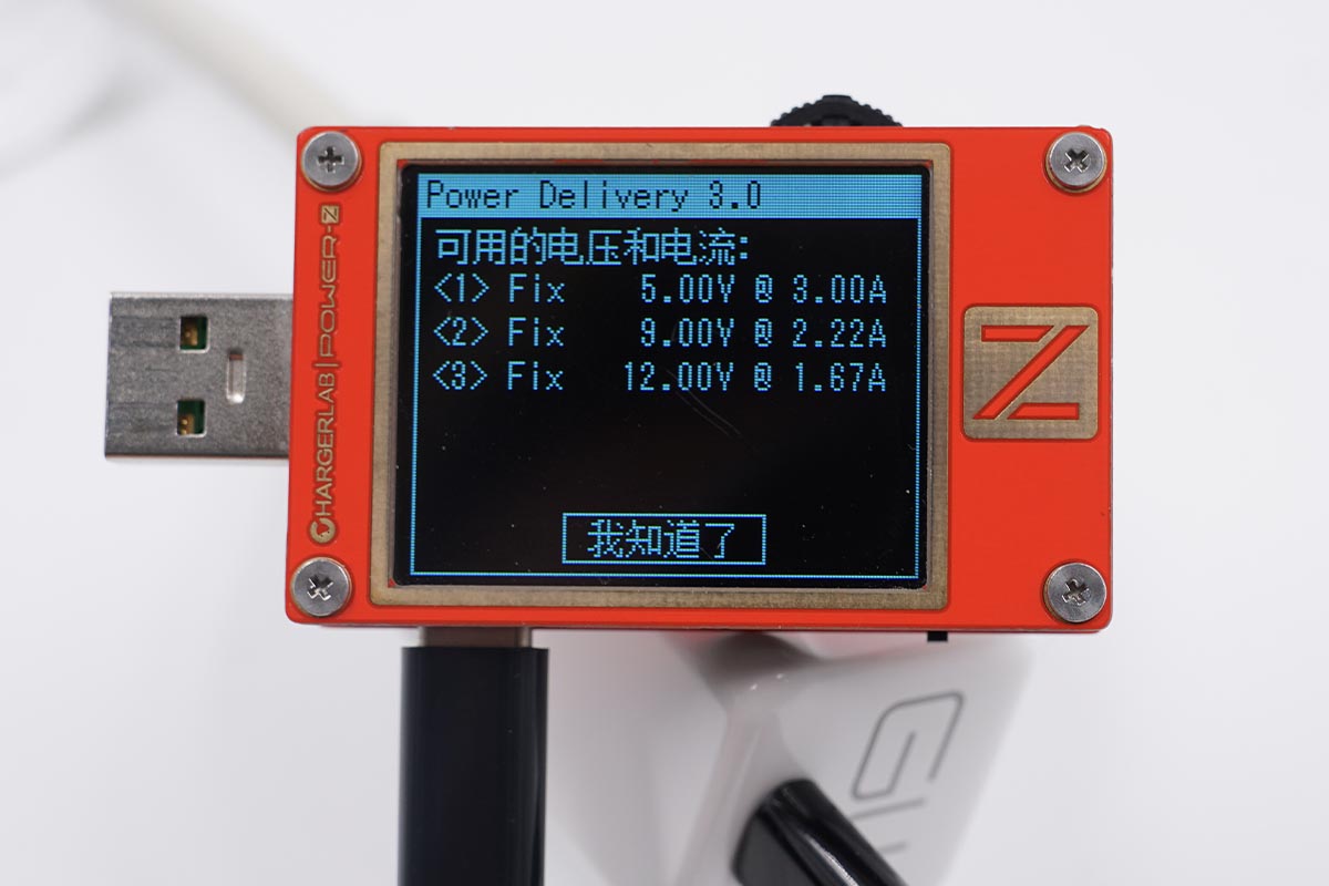 POWER-Z KT002读取中正仁和20W迷你PD充电器发现共支持三个固定电压输出档,分别是5V3A / 9V2.22A / 12V1.67A,最大输出功率20W。