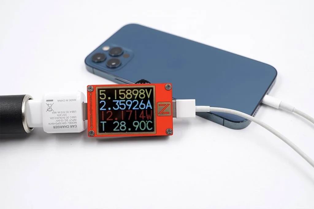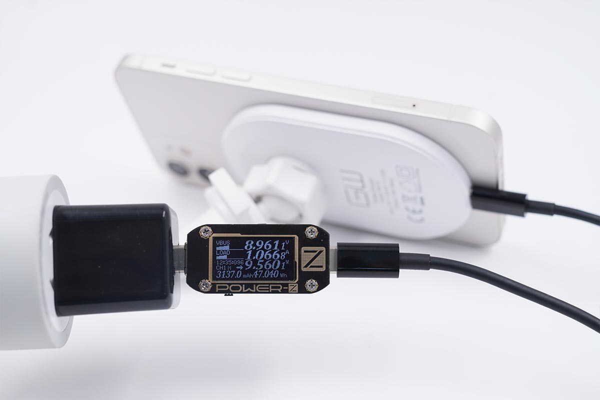 通过POWER-Z KM001C USB测试仪,监测中正仁和MagSafe磁吸无线充电车载支架对iPhone 12 Pro Max实际充电情况,功率为8.96V 1.06A 9.56W。