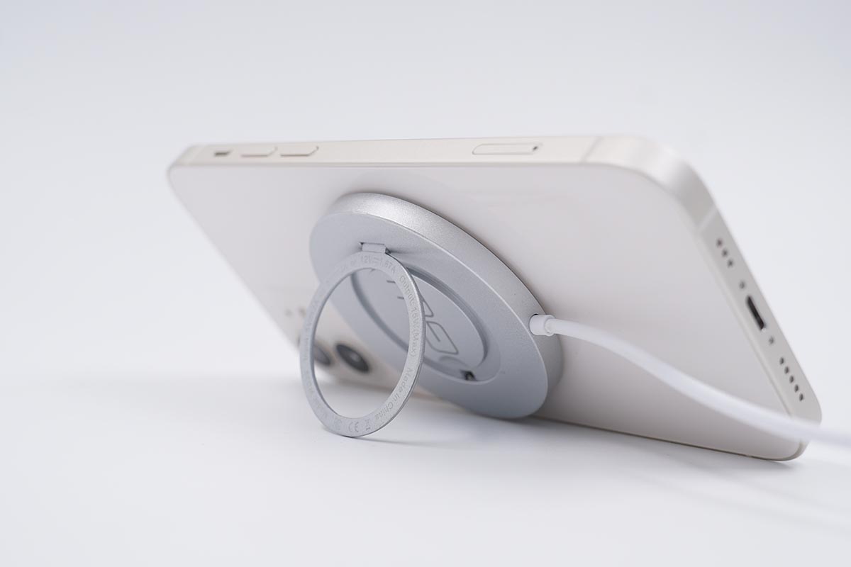 中正仁和支架式MagSafe磁吸无线充电器外观与苹果MagSafe无线充类似,但在底座上设置了一个活动扣环,收纳时扣环齐平于壳体不会影响平放使用。