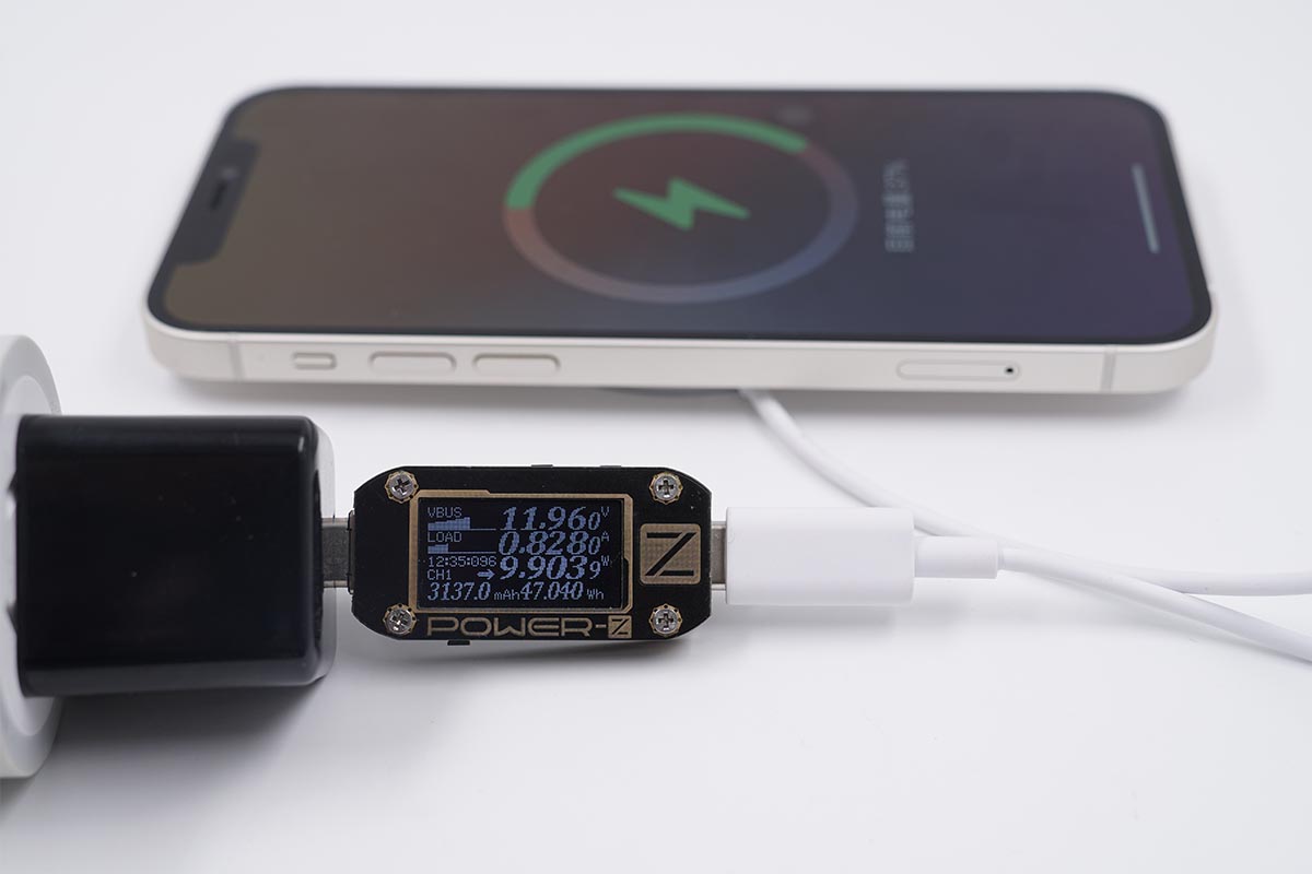 使用POWER-Z KM001C USB测试仪监测中正仁和支架式MagSafe磁吸无线充电器对iPhone 12 Pro Max充电,从iPhone屏幕中可以看到触发了苹果MagSafe充电动画,无线充输入功率11.96V 0.82A 9.9W。