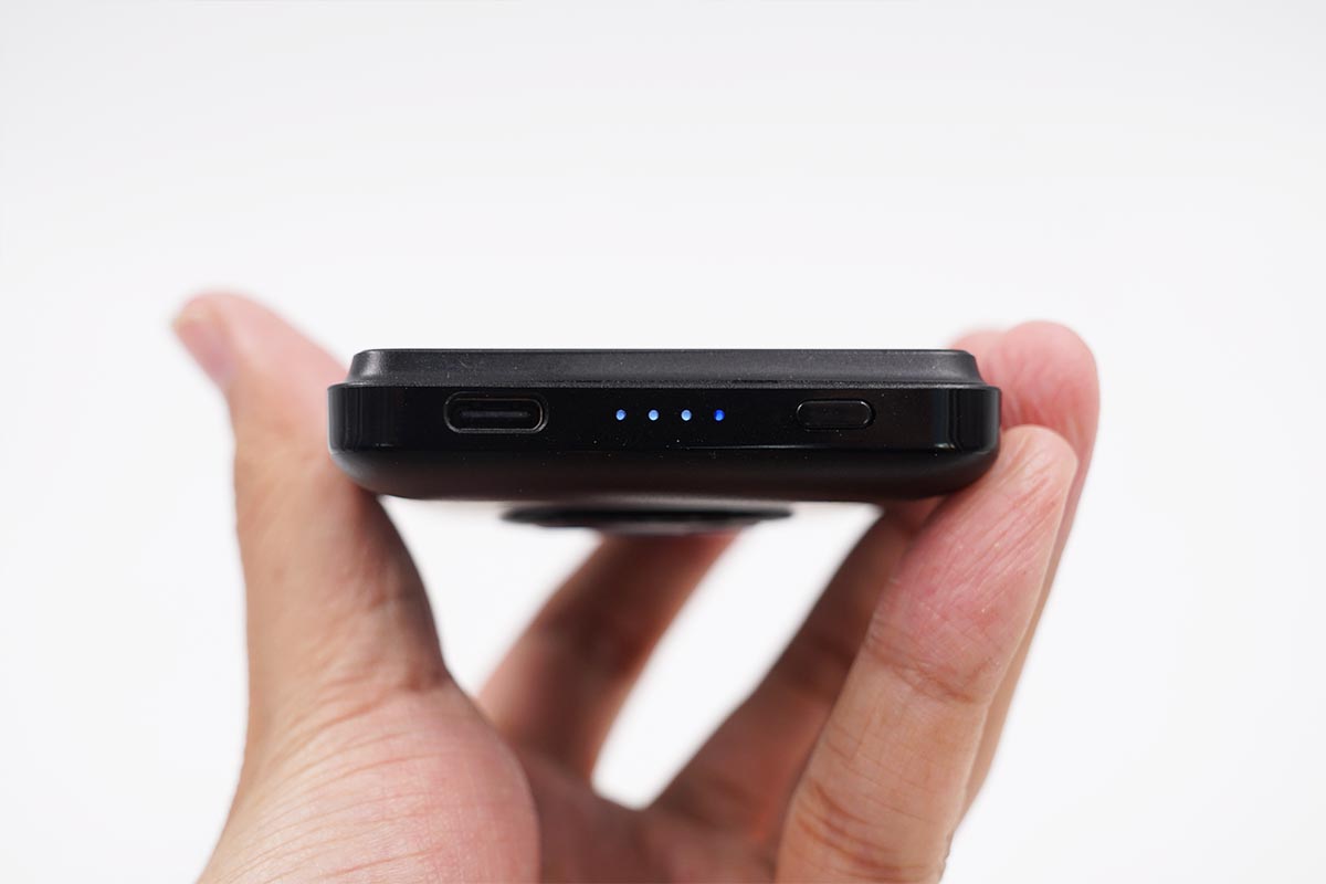 中正仁和MagSafe磁吸无线充电宝底部带有一个USB-C接口,支持5V3A / 9V2A / 12V1.5A有线快充输出,中间是四颗电量LED灯,右边是开关。
