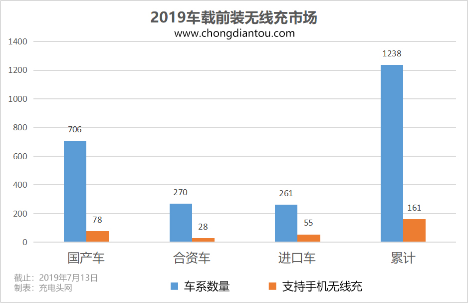 我们来分析数据,市面1238个车系车系中,国产车有706个,其中支持手机无线充电的的有78个;合资车有270个,支持手机无线充电的的有28个;进口车有261个,支持手机无线充电的的有55个。