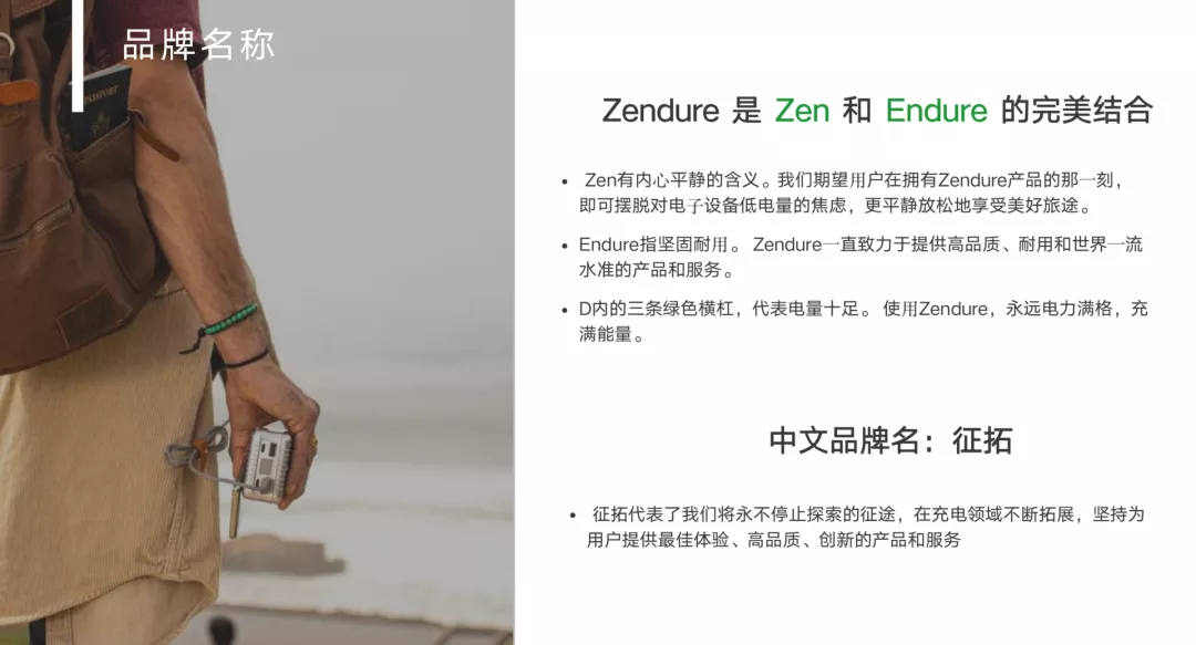 征拓品牌的英文名称是Zendure,是Zen和Endure的完美结合,象征着用户在拿到产品就可以摆脱对设备低电量的恐惧,并且产品坚固耐用,D里面的三条绿色横杠代表了电力十足,象征着永不断电,充满能量。