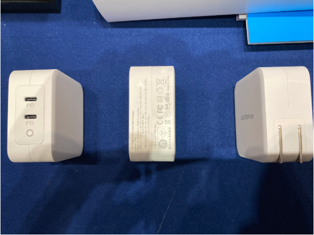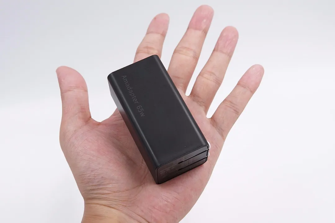 飞频100W双C氮化镓充电器外观方正,侧面中间印有“Amadapter“logo,非常简洁;采用氮化镓材料,体积得以如此娇小;充电器的两个USB-C接口单口最高支持100W,支持盲插;采用可折叠插脚,收纳携带也十分方便。