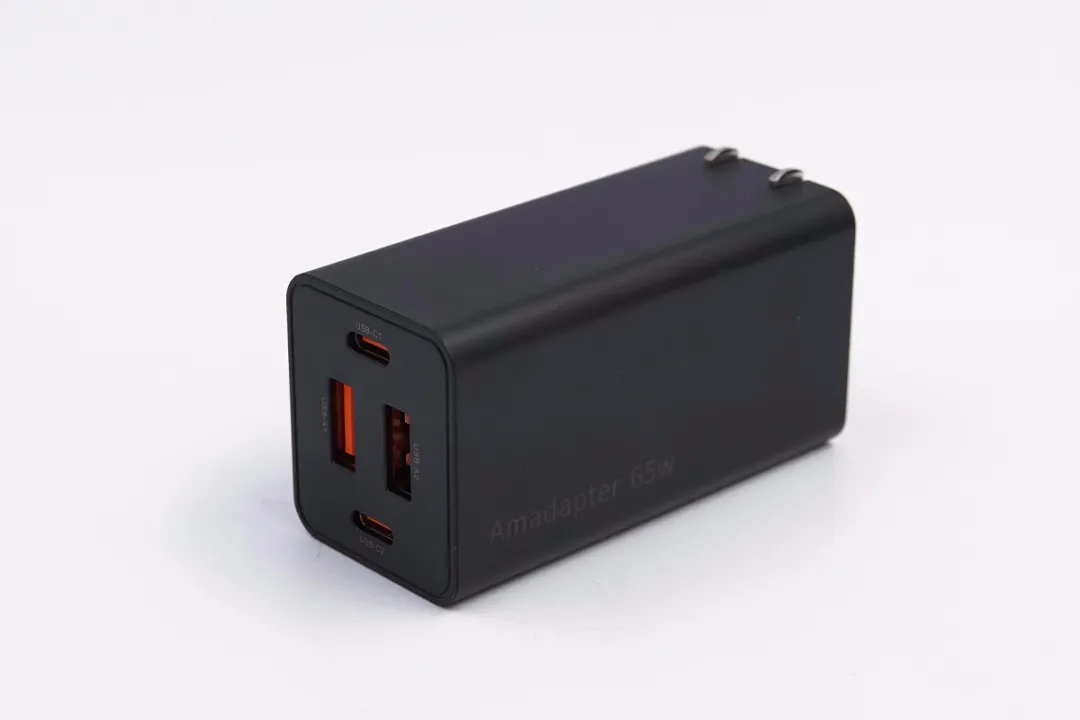 Amadapter飞频四口PD快充充电器整体为黑色,有黑白两色可选,简洁稳重,一体感很强,给人炫酷、稳定的感觉。它拥有65W功率输出,两个USB-C接口和两个USB-A接口,支持笔记本、平板、手机、手表手环、TWS耳机等设备充电,一个充电器就可以兼顾多设备同时使用十分灵活。