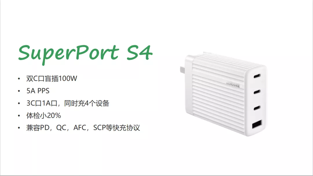 SuperPort S4外观经典,罗马柱纹理美观耐磨,独树一帜,体积相比同类产品小了20%。充电器接口配置为3C1A,其中双C口盲插100W,可以同时为四台设备充电。