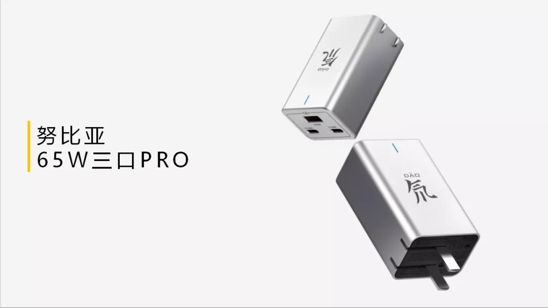 努比亚氘锋65W氮化镓三口充电器继承家族式外观,以银灰色为主,侧面印有“DAO氘”字样,个性十足。三个充电口的排布并非以往充电器“一字排开”,而采用“三足鼎立”式的排布。