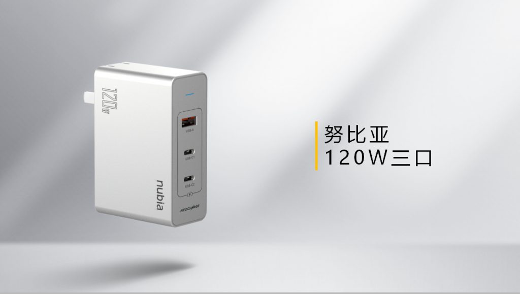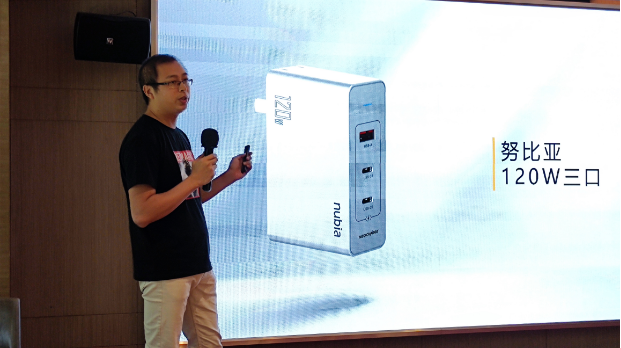 罗炜先生还在演讲中透露了重磅产品——努比亚氘锋120W氮化镓三口充电器。这款充电器也是继承家族银灰外观,机身除了印有“nubia”logo之外,还印有“120W”字样,表明其最高支持120W同时充电。
