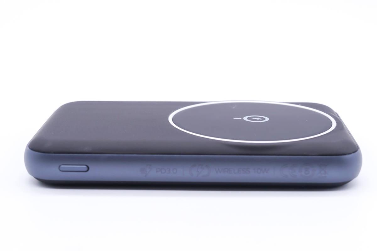 充电宝整体采用了类似三明治的结构设计,上下两侧硅胶仿生皮材质并使用类肤质涂层覆盖,中间使用铝合金加固。左侧为电源按键,从侧面的标识中可以了解到充电宝支持PD3.0快充与10W的无线输出功率。