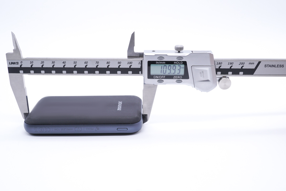 尺寸方面,使用卡尺实测充电宝的长度约为109.93mm。