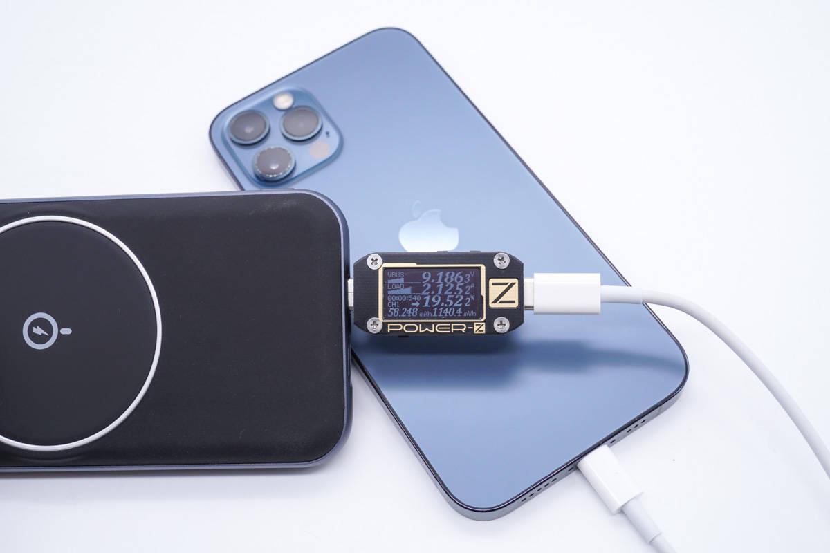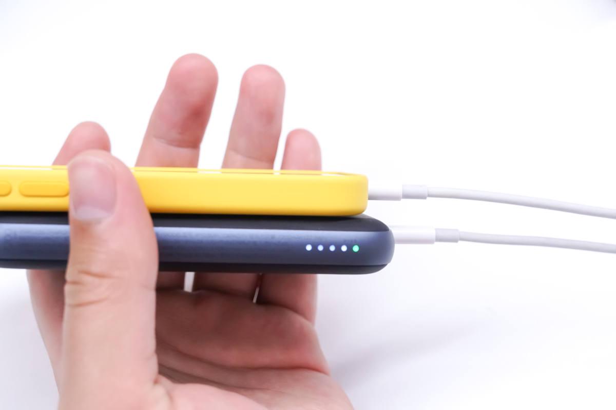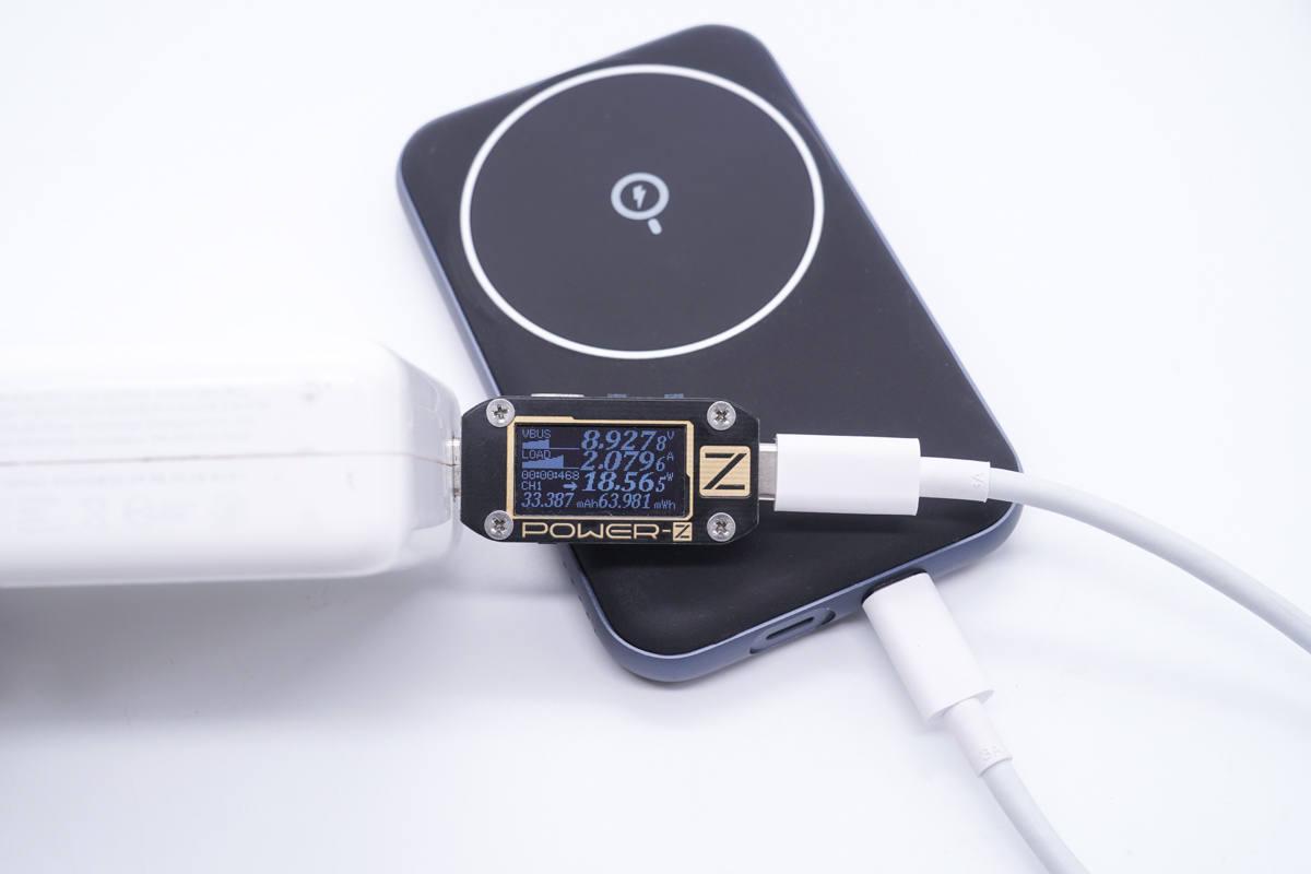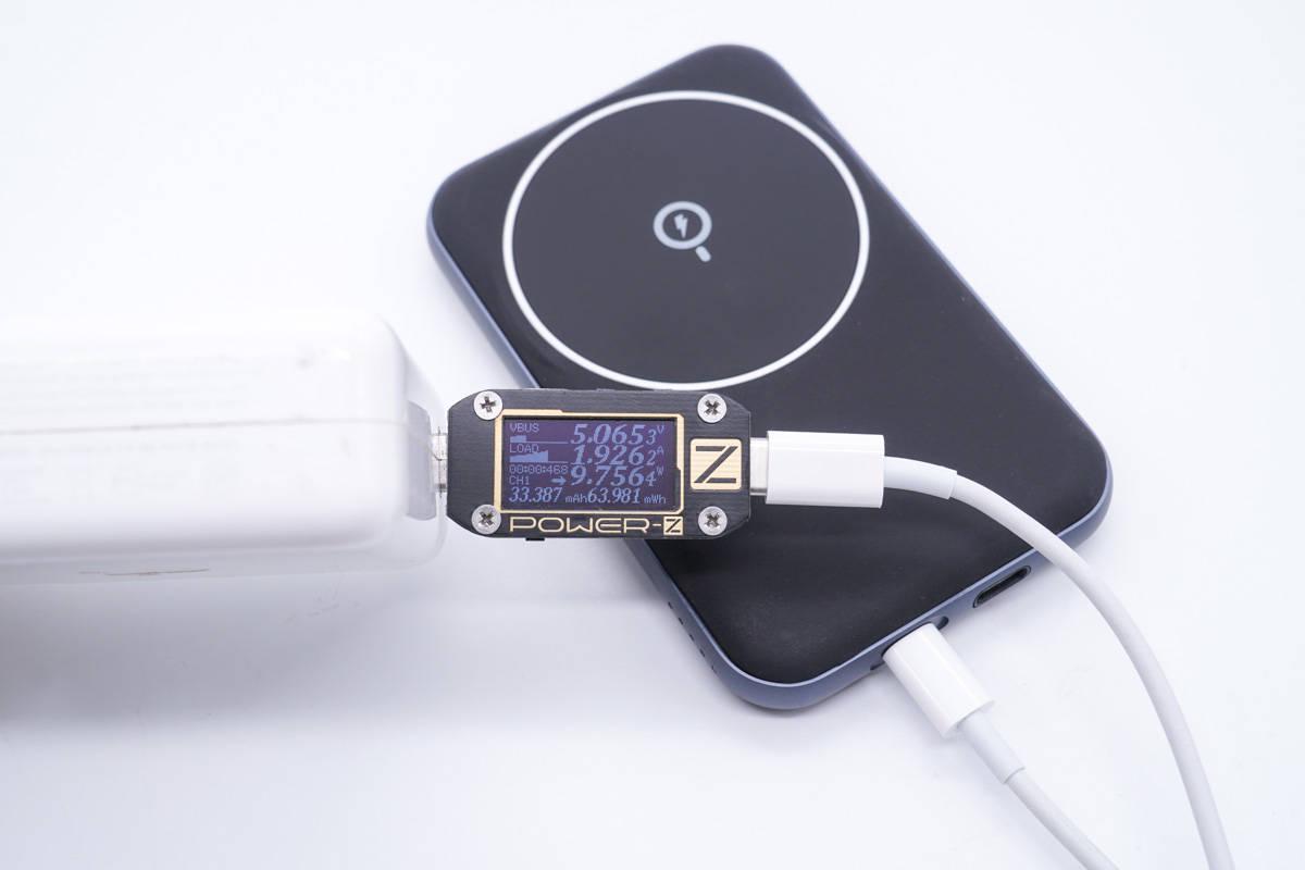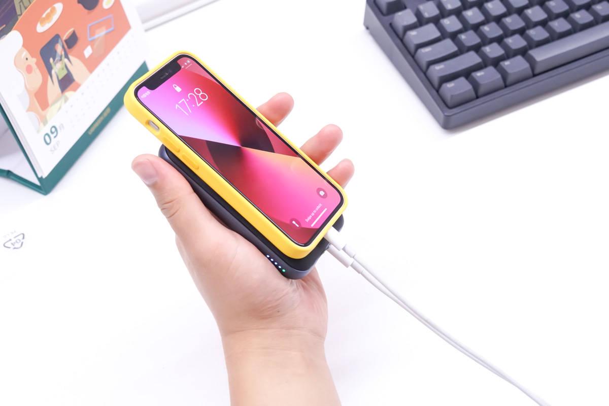 甚至可以使用磁吸来将充电宝固定在手机背面,然后使用Lightning快充线通过USB-C接口为手机提供20W的有线快充。