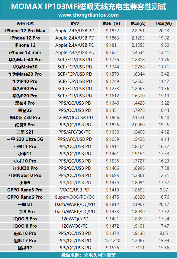 将所有手机的测试数据汇总,可以看出为大部分手机都可以提供快充服务,整体的快充兼容性不错。