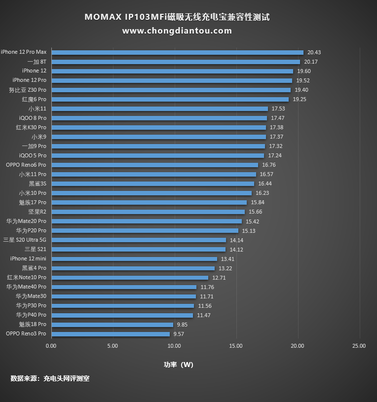 柱状图部分iPhone 12 Pro Max的功率最高,其他设备的功率走向较为平缓。