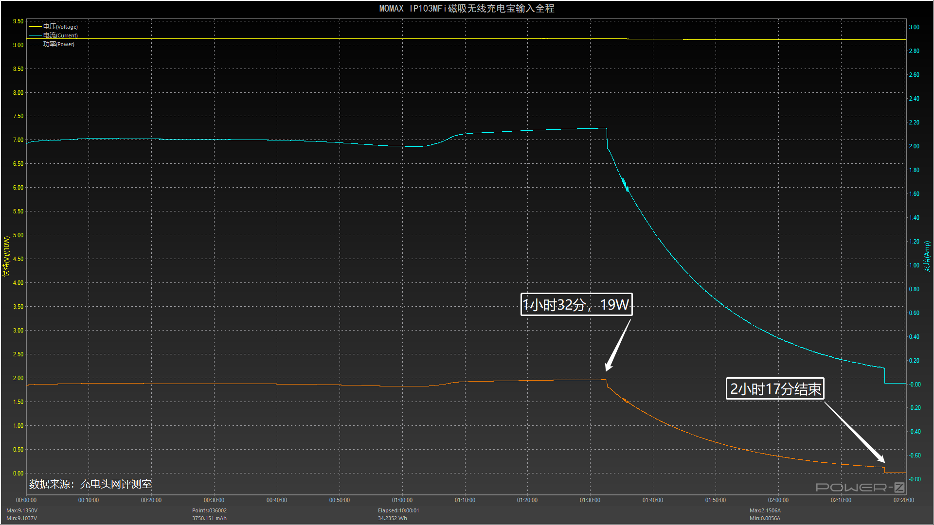 这里测试了使用PD充电器通过USB-C为充电宝自充电的全程,于1小时32分开始降功率,于2小时17分充电结束。
