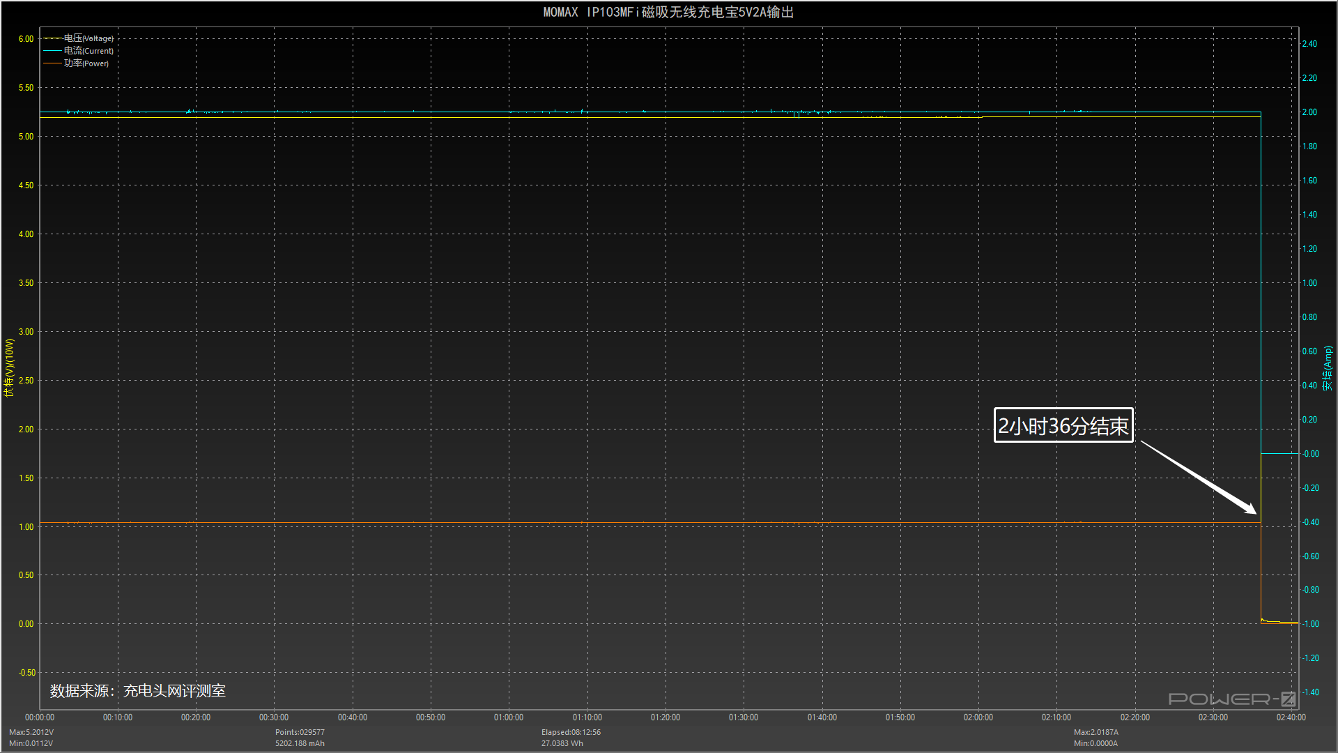 除了测试输入外,此次还对充电宝的输出进行了测试,首先让充电宝持续以5V2A档位输出,全程耗时约2小时36分。放出的能量约为27.0383Wh,所以充电宝在以5V2A档位持续输出时的效率约为27.0383/27.3=99.04% 。