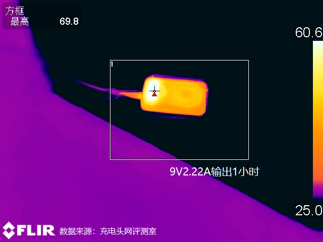 之所以会有输出效率是因为充电宝在工作时内部会涉及到升降压输出,损耗的部分往往以热量的形式散发出来,所以此次也增设了对充电宝温度方面的测试。测试条件为让充电宝以9V2.22A 20W的功率持续满载输出1小时后采集表面的温度,测试基于25℃的恒温箱内进行。
