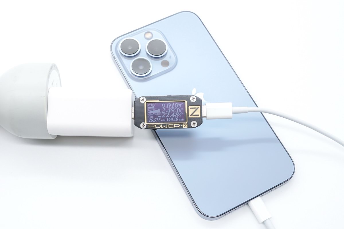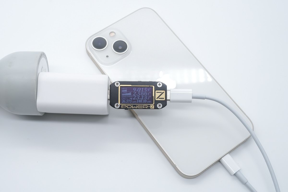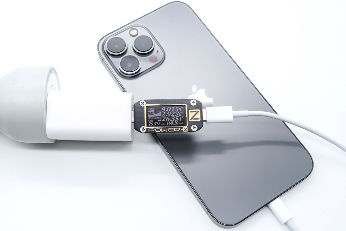 iPhone 13全系列快充性能相比起上一代有了小幅度提升,特别是容量高达4352mAh的iPhone 13 Pro Max,充电头网实测iPhone Pro Max最大功率接近27W。小编使用斯泰克33W 1A1C充电器USB-C对iPhone 13 Pro Max充电,功率达到9.01V 2.92A 26.35W,完美握手PD快充并达到最大值。