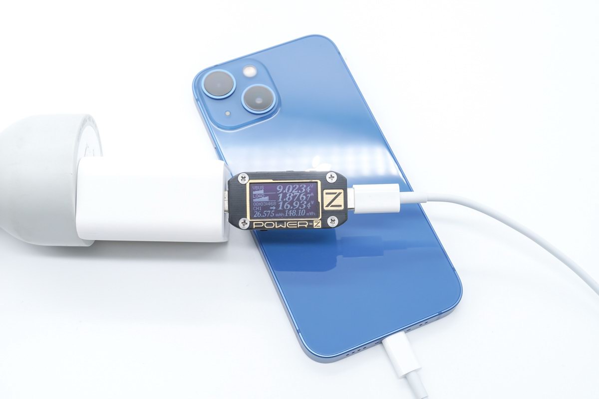 斯泰克33W 1A1C充电器USB-C对iPhone 13 mini充电,功率达到9.02V 1.87A 16.93W,完美握手PD快充并达到最大值。