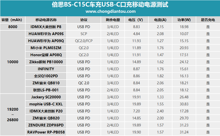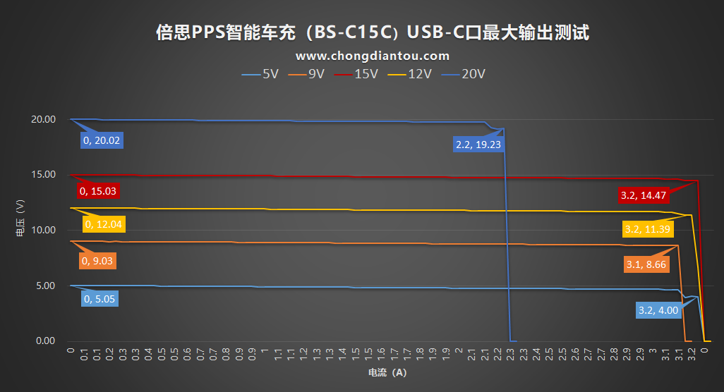 USB-C口在5V电压下最大输出4V/3.2A;9V电压下,最大输出8.66V/3.1A;12V电压下,最大输出11.39V/3.2A;15V电压下,最大输出14.47V/3.2A;20V电压下,最大输出19.23V/2.2A。各档位实际最大输出要比标称值高,最大输出达46W。