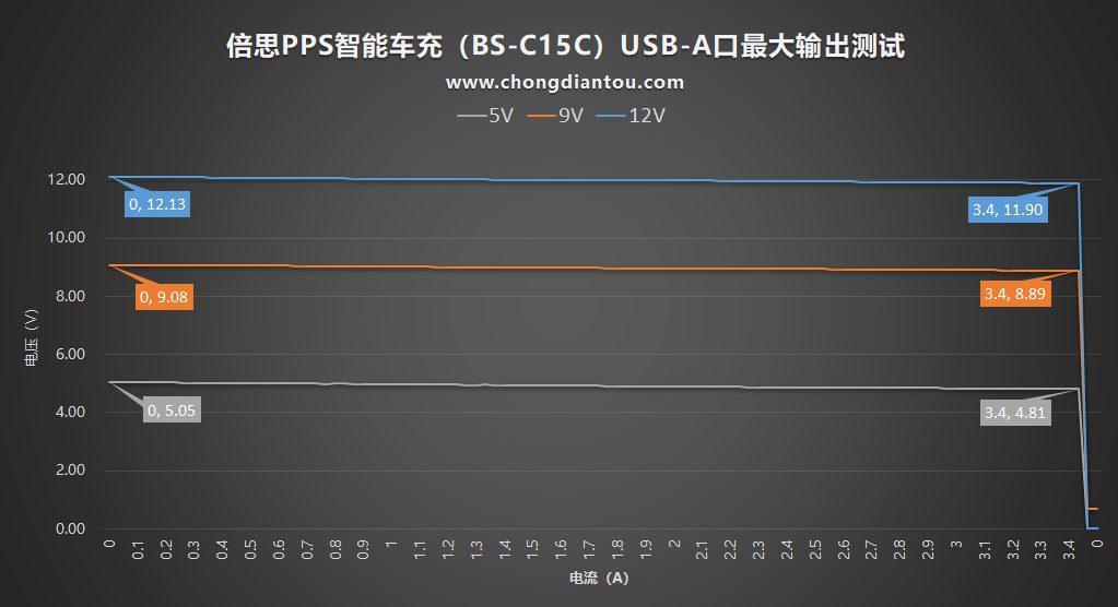 USB-A口在QC2.0协议模式下,5V电压档位最大输出16.35W,9V电压档位最大输出30.22W,12V档位最大输出40.46W。