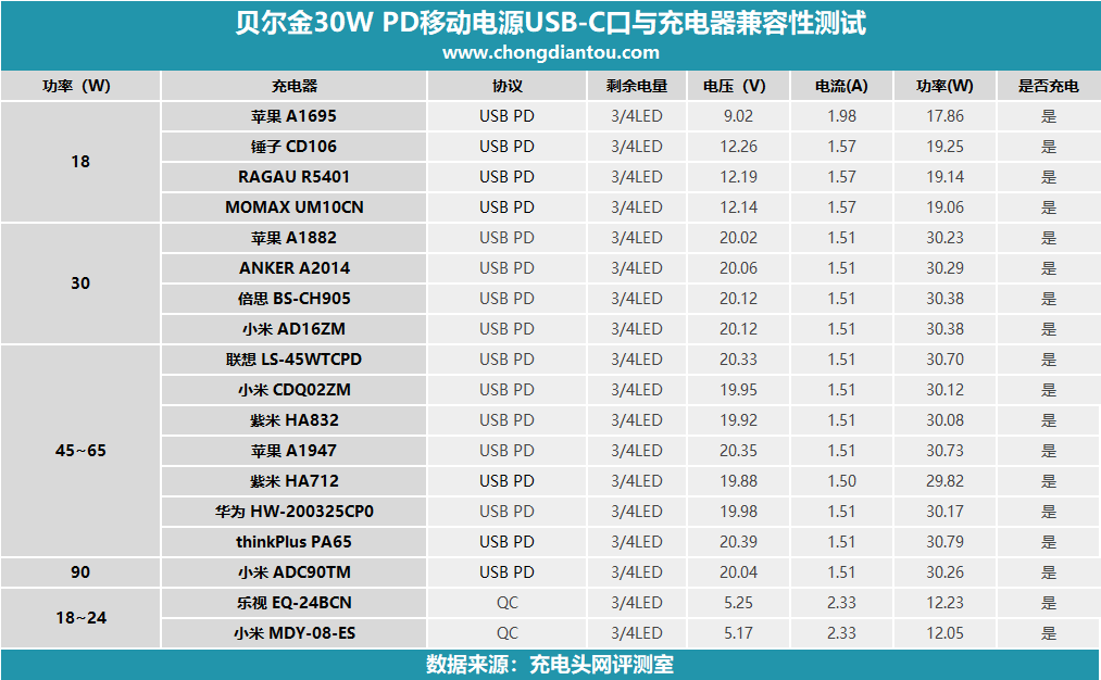 使用小米90W PD充电器给移动电源充电,电压20.04V,电流1.51A,功率30.32W,开启PD快充。