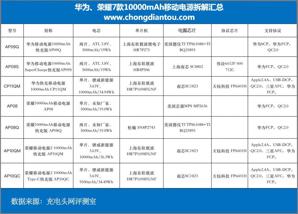 通过上面的拆解,我们为大家整理了以下表格,7款移动电源的协议芯片、电芯、单片机等全都在这里。