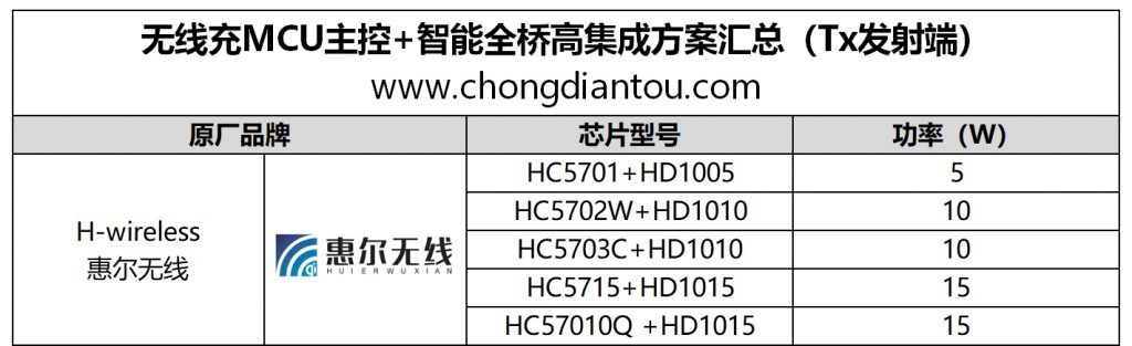 惠尔无线推出有多款无线充专用集成芯片,打入飞利浦等世界知名企业供应链。其中HC5701是一款5W超高性价比的无线充方案专用IC;HC5703C 是一款无线充电专用 IC,控制输出功率最高可达 15W。拥有完善的保护电路,先进的算法、超高的效率和良好的兼容性,适用于稳定性要求较高的产品。