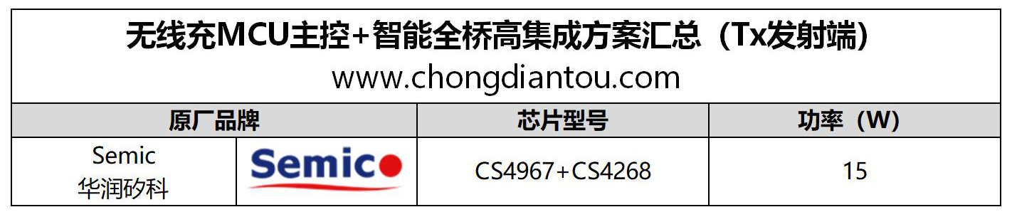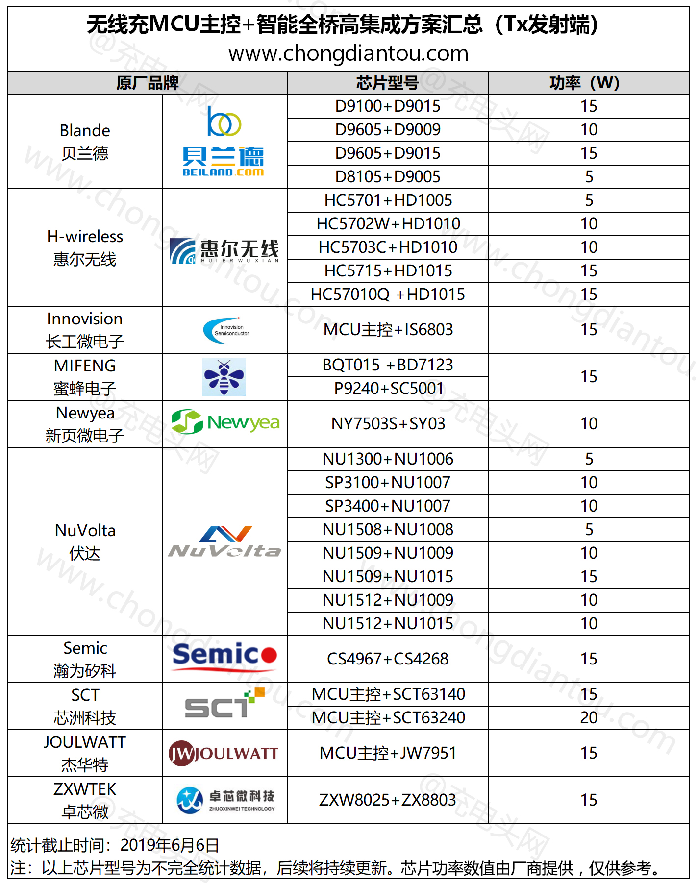为了方便下游企业选型对比,充电头网将无线充SoC芯片方案,以及MCU主控+PowerStage智能功率全桥方案进行了整理汇总(按首字母先后排序)。