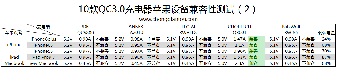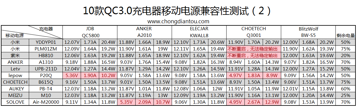 对手机的兼容性测试,由于无法收集如此众多的QC快充手机,只能测试移动电源。