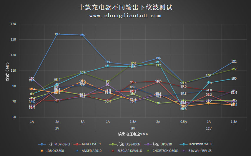 以220V交流为输入电压,分别测试各充电器在5V(1A/2A/3A)、9V(1A/1.5A/2A)、12V(0.5A/1A/1.5A)下的纹波值。统计结果如下:
