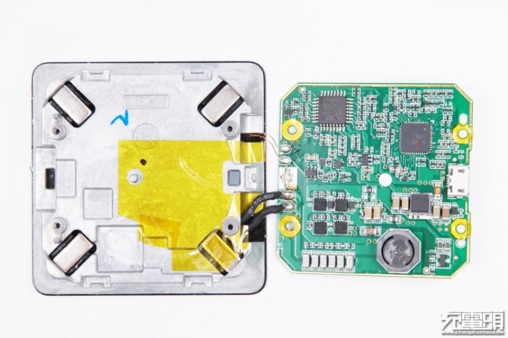 从充电头网此前拆解的谷歌nexus无线充电器来看,其内部四个角落就分别设置了一颗磁铁用于定位。同时,这款无线充电器兼容Qi标准并可提供5W的无线充电功率。