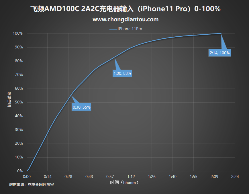 充电测试数据制作成表格,飞频四口PD快充充电器半小时为iPhone 11 Pro充入55%电量;1小时为iPhone 11 Pro充入83%电量;全程耗时方面,iPhone 11 Pro全程充电耗时2小时14分。