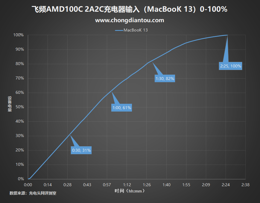 飞频四口PD快充充电器半小时为为MacBook Pro 13充入31%电量;1小时为为MacBook Pro 13充入61%电量;全程耗时方面,MacBook Pro 13全程充电耗时2小时25分。