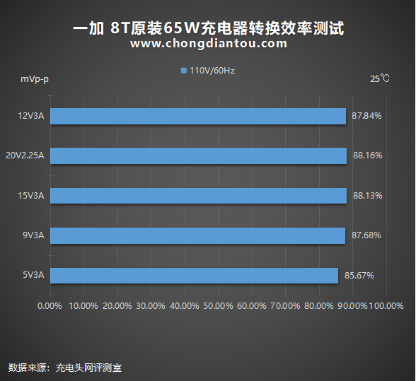 一加 8T原装65W充电器在110V 60Hz交流输入的情况下进行了转换效率测试,测试结果如下: