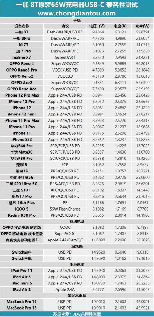 为了方便大家查阅,我们将充电兼容性的测试数据放在表格当中。一加 8T的功率为60W左右,一加 8 Pro的功率在更新至最新系统后达到23W左右,其他OPPO系机型中OPPO Ace2和Reno4都表现不俗,直奔60W;苹果设备均很好的握手PD快充协议,三星 S20 Ultra 5G手机以及努比亚红魔5G手机均成功握手PPS快充,魅族17 Pro功率也超过23W;两台MacBook功率都在43W左右,可喜可贺;其他设备表现也都符合预期,iQOO 5由于是私有快充协议,表现正常。