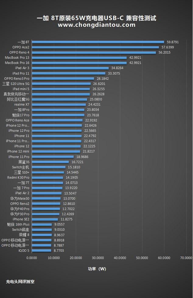 为了更直观的表现,我们将测试数据放在柱状图当中。可以看到排名最靠前的自然是一加8T和OPPO Ace2和Reno4;紧随其后的是两台笔记本和iPad;排在最后的是两款OPPO移动电源和iQOO 5 Pro。