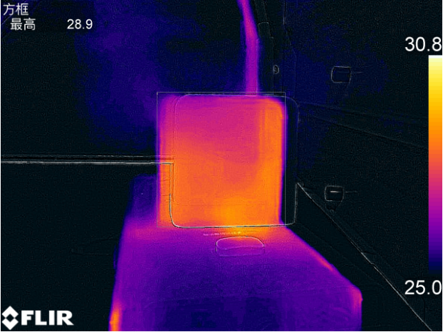 对充电器的温升进行测试,测试条件为在温度约为25℃的恒温箱内以20V 2.25A 45W的功率持续输出一小时进行测试。准备开始测试前,最高温度为28.9℃。