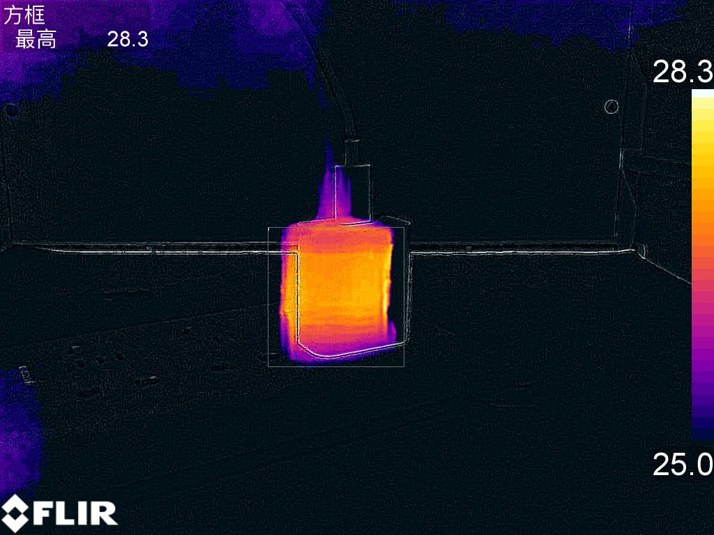 对充电器的温升进行测试,测试条件为在温度约为25℃的恒温箱内以9V 2.22A 20W的功率持续输出一小时进行测试。准备开始测试前,最高温度为28.3℃。