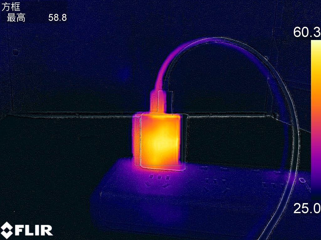 一小时后,当前最高温度为58.8℃,主要集中在充电器中部,温度上升了30.5℃。