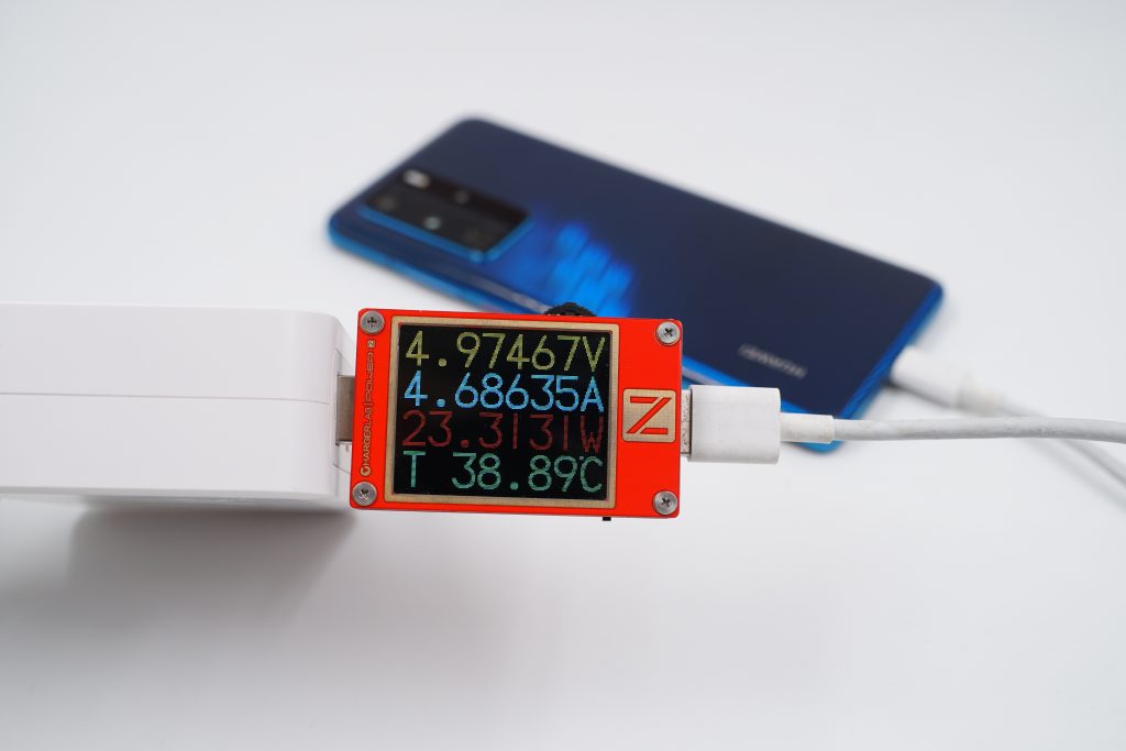 使用斯泰克30W 2C2A 氮化镓充电器的USB-A接口为华为P40 Pro充电,功率为4.97V 4.68A 23.31W。