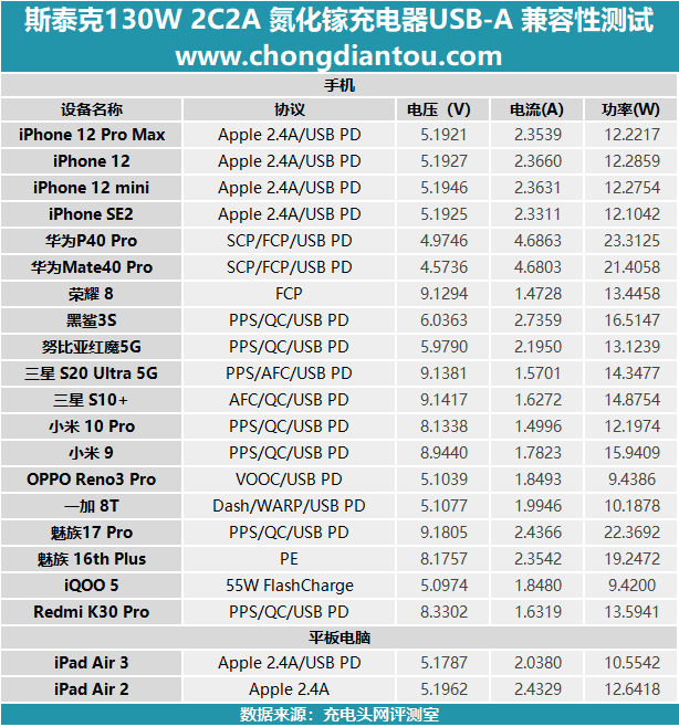为了让大家更方便查阅,我们将充电器USB-A接口充电兼容性的测试数据放在表格当中。四台iPhone功率都在12W左右;安卓机型中华为和魅族的表现最好,四台旗舰从19W到23W递增。