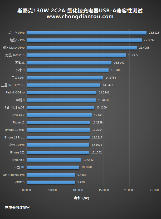 为了更直观的表现,将数据放在柱状图当中,华为和魅族排名自然最高,排在最后的是OPPO和vivo的旗舰,功率都不超过10W。