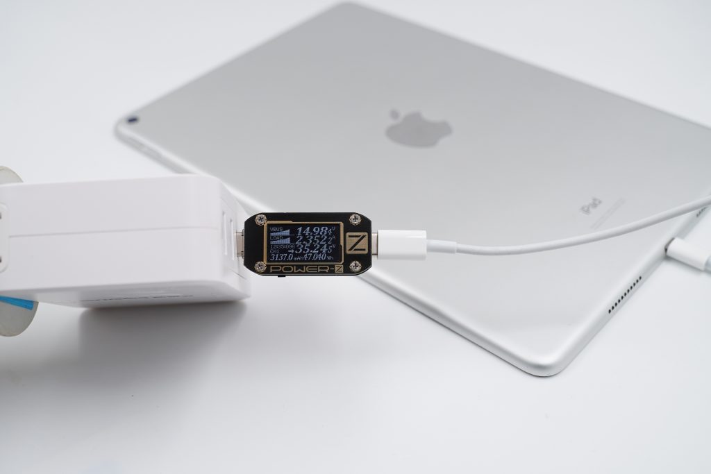 使用USB-C1为iPad Air4充电,功率为14.82V 2.04A 30.28W;使用USB-C2为iPad Pro 11充电,功率为14.91V 2.06A 30.86W