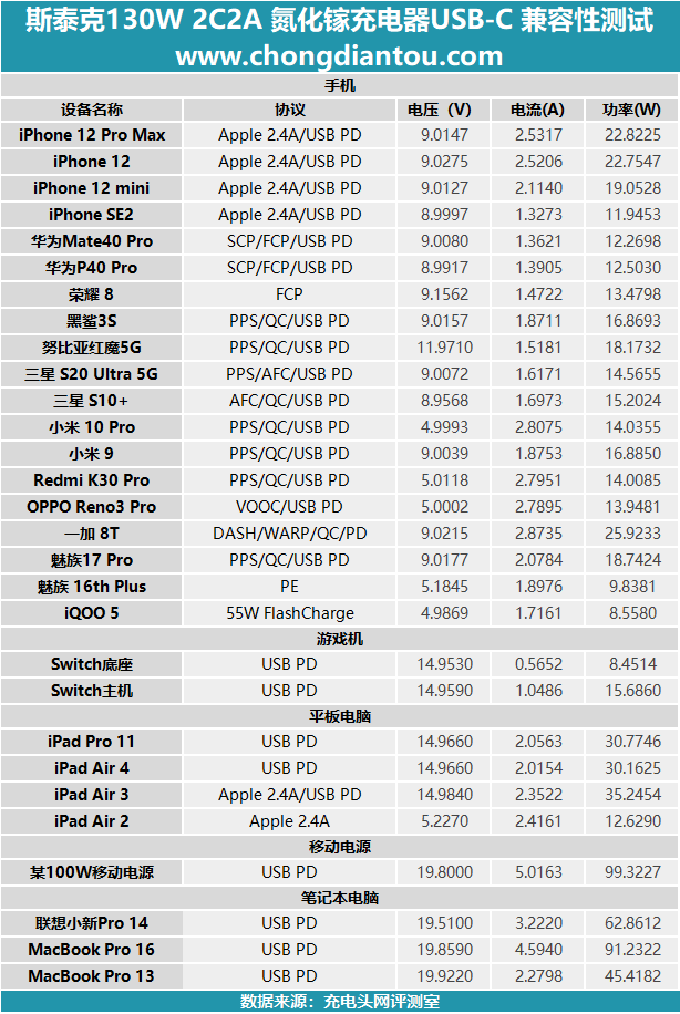 将充电器USB-C接口充电兼容性的测试数据放在表格当中。可以看到大部分设备都符合预期,iPhone 12系列除了mini功率都超过22W;除了Air2,其他三款iPad功率都超过30W。安卓机型除了一加 8T,其他都乏善可陈。Switch与其底座都达到正常水平,三款笔记本都接近各自的峰值功率。