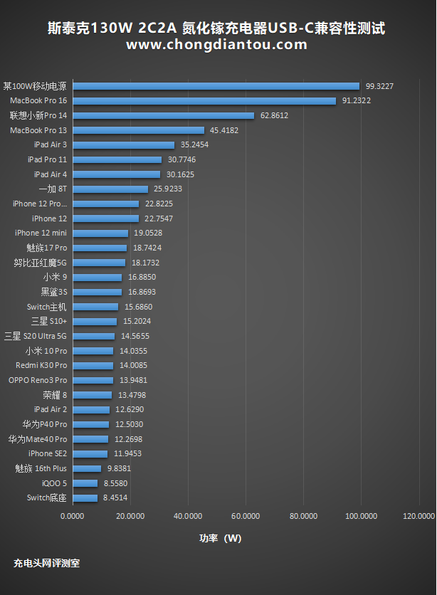 将数据放在柱状图当中,一款100W级别的移动电源排名最前,紧随其后的是三款笔记本电脑,然后是iPad,随后便是安卓旗舰与iPhone 12混杂。