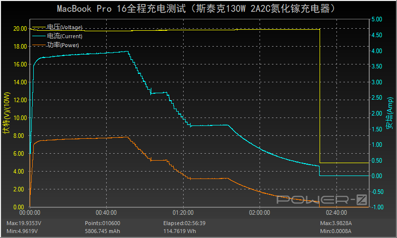 模拟生活的使用场景,使用斯泰克130W 2C2A 氮化镓充电器的USB-C1为MacBook Pro 16充电,来看一下充电全程的变化。经过短暂开机时间,功率到达了20V 5A的功率档位;大功率输入持续了约52分钟,随后后电流和功率开始阶梯式下降直至1小时42分;随后功率随着电流的逐渐下降而下降直至结束。最高功率为19.7V 3.98A 78.48W。