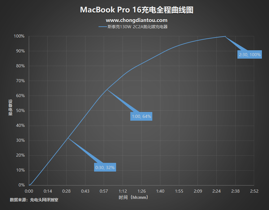 充电测试数据制作成表格,斯泰克130W 2C2A 氮化镓充电器半小时为MacBook Pro 16充入32%电量,1小时充入64%电量,全程耗时约2小时30分。