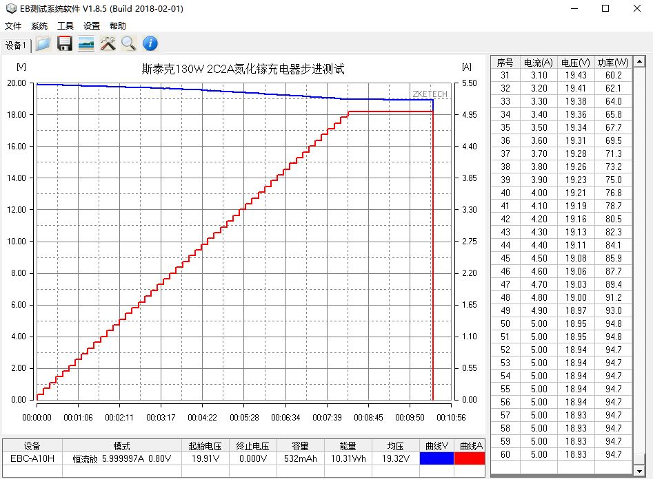 使用EB程控电子负载测试充电器的最大输出功率,以0.1A为电流步进幅度,10秒为时间间隔,最终录得最大输出为18.93V 5A 94.7W。
