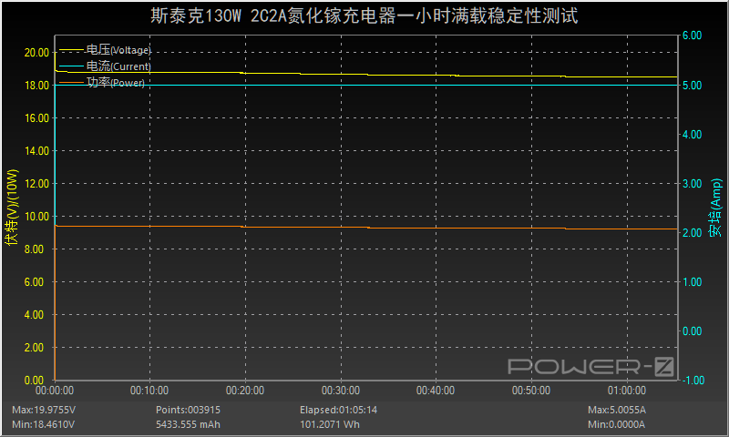 按照额定功率20V 5A 100W满载对斯泰克130W 2C2A 氮化镓充电器进行稳定性测试,测试时间为一小时,测试过程中电压值呈水平直线,无明显波动情况,长时间满载比较稳定。
