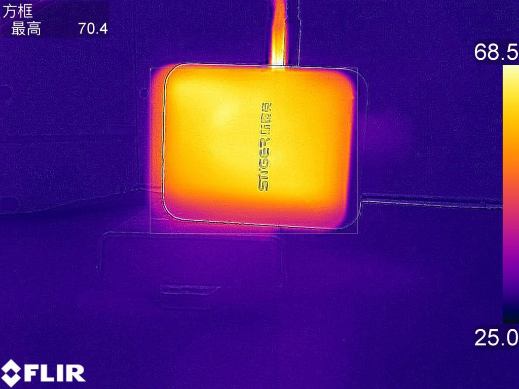 作为参照,满载一小时测试中,低功率密度的氮化镓充电器满载温度一般在60-70度之间,而高功率密度的单口氮化镓充电器一般在70度左右,高功率密度的多口氮化镓充电器温度一般都会超过70度。